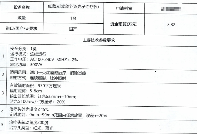 | 3 | 红蓝光谱治疗仪(光子治疗仪) | 1 | 台 | 38200 |